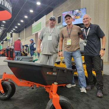 Kart Mate PRO is the world's first commercial articulating kart that mounts to the front of most zero turn or stander mowers. Kart Mate PRO can carry 500 lbs and allow you to travel at the top speed of your mower without adding stress to the mower because you are only pushing it, not adding weight to the mower. The tub can be dumped forward and the entire kart can be lifted vertically on the mower to take up as little space on your trailer. The front casters can also fold in so you can pass through small gates.